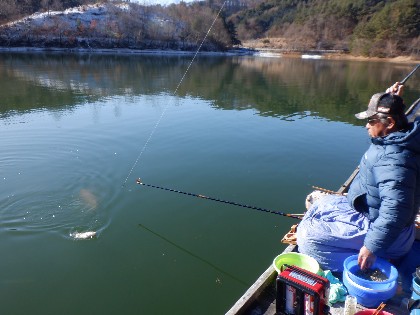 今日の美鈴湖は、早朝の冷え込みがきつく桟橋に霜が降りる中、ワカサギ釣りは20人、ヘラ鮒釣りでは、6人のお客様にお越しいただきました。