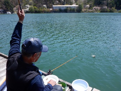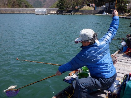 今日の美鈴湖は、よく晴れていても時おり強風が吹き釣り難い中、ワカサギ釣りは7人、ヘラ鮒釣りでは、11人のお客様にお越しいただきました。
