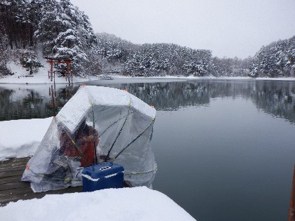 今日の美鈴湖は、昨夜からの雪で30㎝位ありましたが、ワカサギ釣りで2人、ヘラ鮒釣りでは、1人のお客様にお越しいただきました。