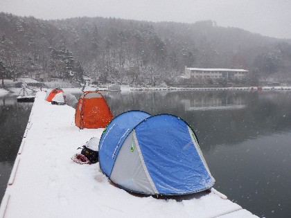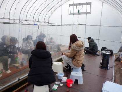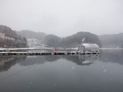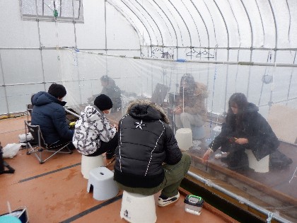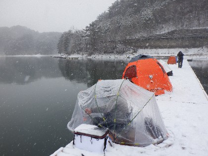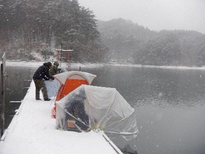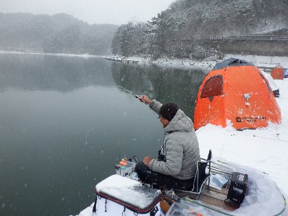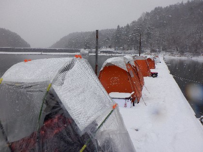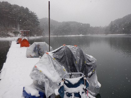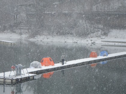 今日の美鈴湖は朝から雪が降る中、ワカサギ釣りのみ27人の、お客様にお越しいただきました。