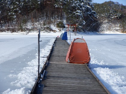 今日の美鈴湖は、穏やかな釣り日和になり、ワカサギ釣りが