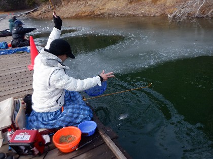 今日の美鈴湖は、気温が上がり暖かいけれど、風が吹き釣り難い中、ワカサギ釣りは21人、ヘラ鮒釣りでは、6人のお客様にお越しいただきました。