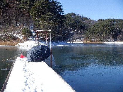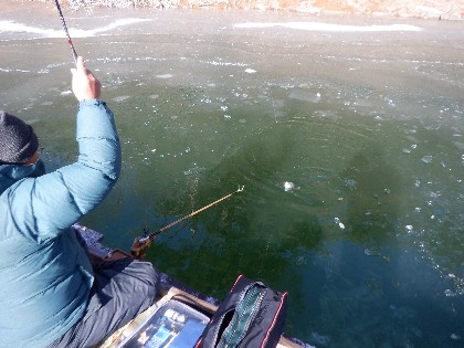 今日の美鈴湖は早朝の冷え込みで、湖面全体に2~3cmくらいの氷が張りました。そんな中、ワカサギ釣りは12人、ヘラ鮒釣りでは、1人のお客様にお越しいただきました。