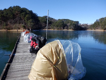 今日の美鈴湖は、よく晴れて気温が上がるけれど、風が吹き釣り難い中、ワカサギ釣りは28人、ヘラ鮒釣りでは、5人のお客様にお越しいただきました。