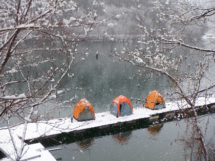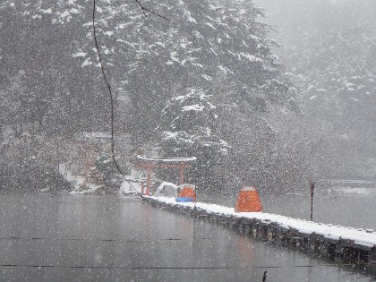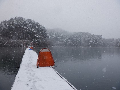 今日の美鈴湖は早朝から雪が降り始め、気温が上がらない寒い中、ヘラ鮒釣りで5人、ワカサギ釣りでは、10人のお客様にお越しいただきました。