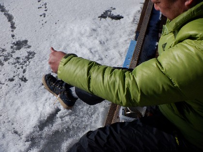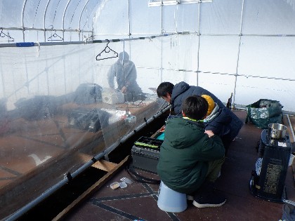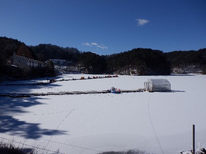 今日の美鈴湖は早朝に、ー12度と冷え込みました。そんな中、79人のお客様にお越しいただきました。又、氷厚を測定したところ、2~3日前まで未凍結の所が5cm位で、それ以外は10cm前後でした。