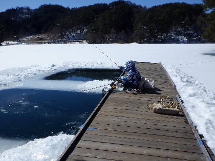 今日の美鈴湖は早朝冷え込みがきつく、ようやく昼くらいから気温がプラスになる中、ヘラ鮒釣り2人、ワカサギ釣りでは11人のお客様にお越し頂きました。