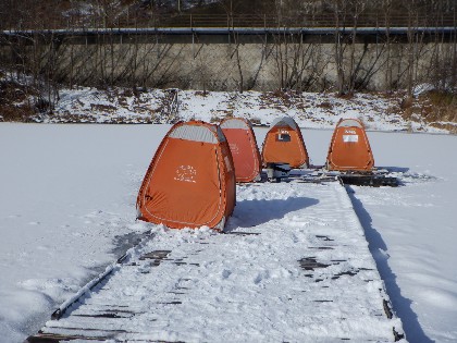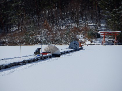 今日の美鈴湖は、昨夜の雪で5cmほど積もりました。そんな中、ヘラ鮒釣りは0人、ワカサギ釣りでは12人のお客様にお越し頂きました。