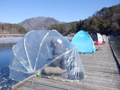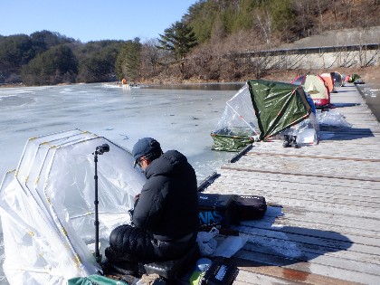 今日の美鈴湖は早朝の冷え込みがきつく(-11度)、氷厚は10cmくらいになりました。そんな中、ヘラ鮒釣りは2人、ワカサギ釣りでは63人のお客様にお越し頂きました。