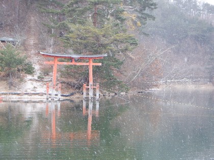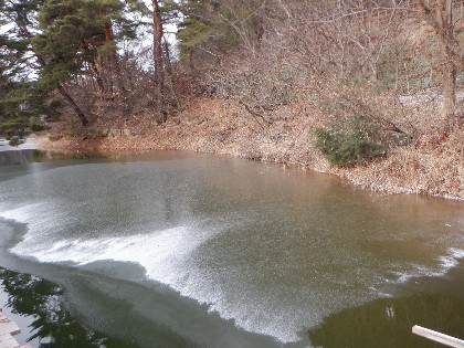 今日は美鈴湖の岸の一部に、薄氷が張りました。