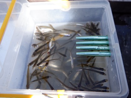 午後3時の時点では、水道下桟橋中央部で全員の方(3人)が、100匹超えの釣果でした。尚、カラ針のみで130匹超え(2時間30分位)の釣果の方がいらっしゃいました。