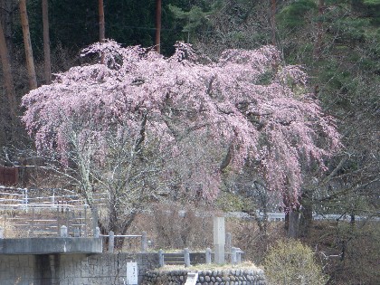 [レイクサイド美鈴横の枝垂桜が満開直前です。・レイク桟橋より望む]