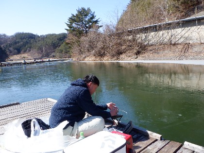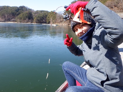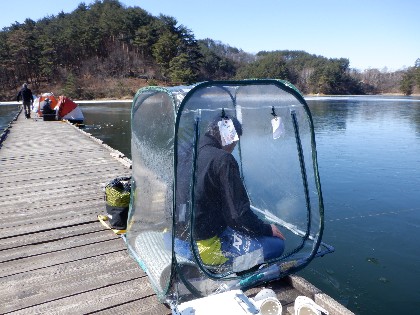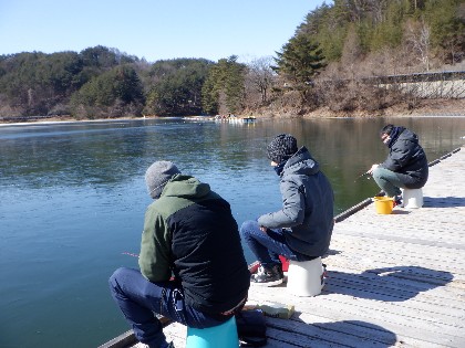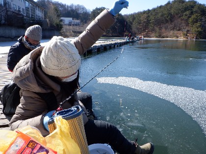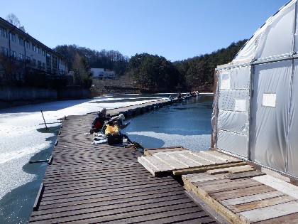 今日の美鈴湖は早朝の気温が-10度となり、1~2cmくらいの氷が張りました。そんな中、ヘラ鮒釣りで5人、ワカサギ釣りでは40人の、お客様にお越し頂きました。