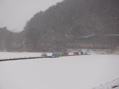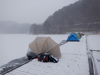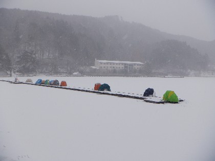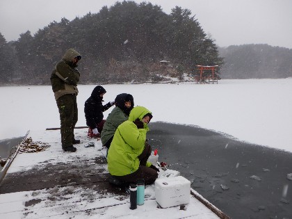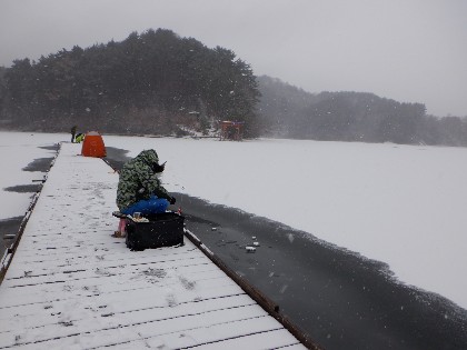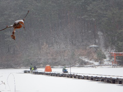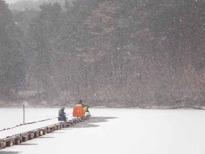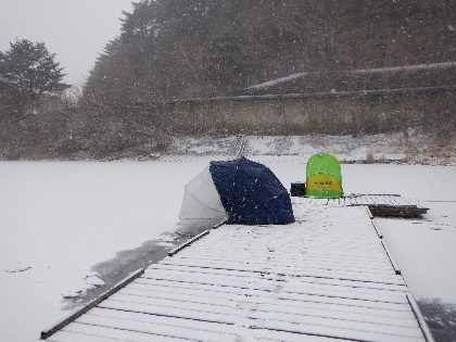 今日の美鈴湖は朝から雪が降り始め、テントが無ければ辛い釣りでした。そんな中、ヘラ鮒釣りは何方もいらっしゃらなく、ワカサギ釣りでは18人のお客様にお越し頂きました。