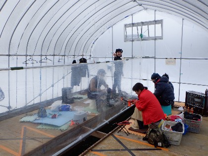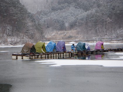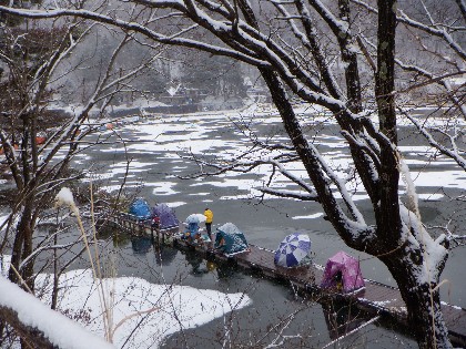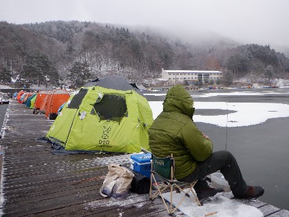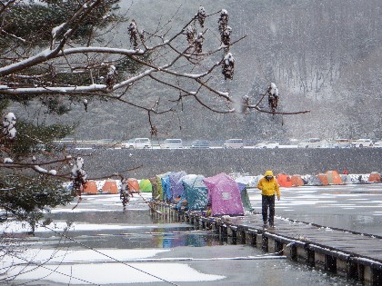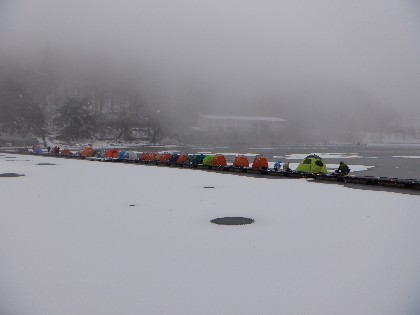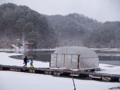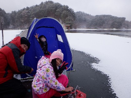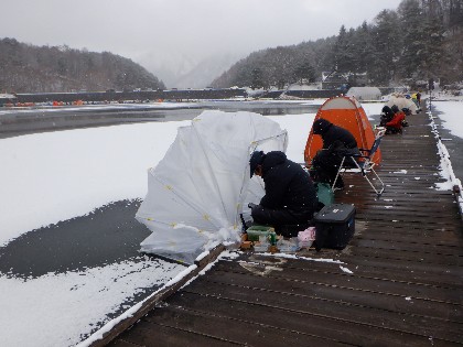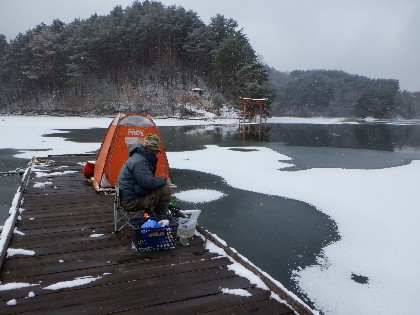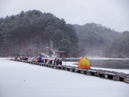 今日の美鈴湖は午前中雪降りでした。そんな中、ヘラ鮒釣りで8人、ワカサギ釣りでは、子供さんを含め98人のお客様にお越し頂きました。