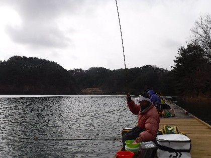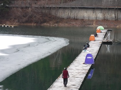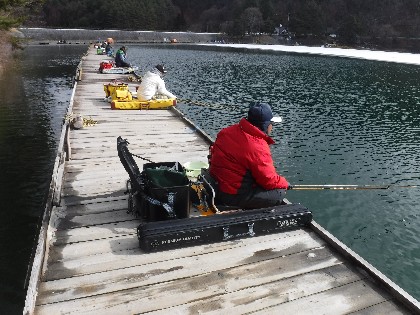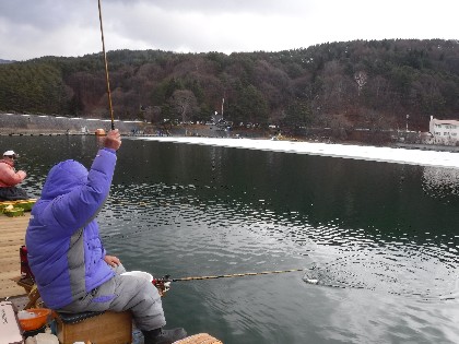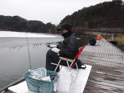 今日の美鈴湖は、夜半に降った雪が氷の上に積りましたが、桟橋周りに氷が無く、釣果は思ったほど上がりませんでした。そんな中、ワカサギ釣りで22人、ヘラ鮒釣りでは10人のお客様にお越し頂きました。