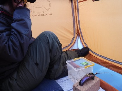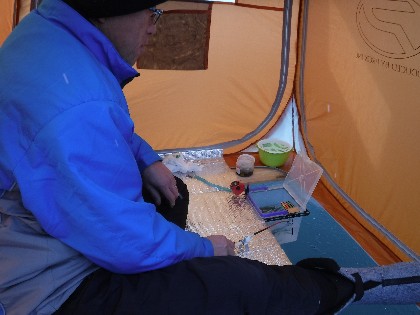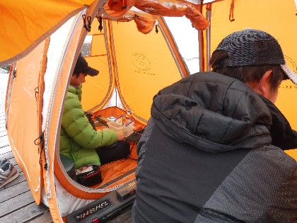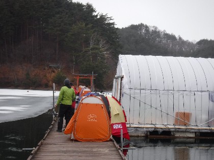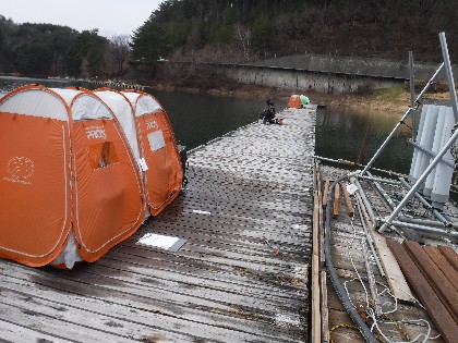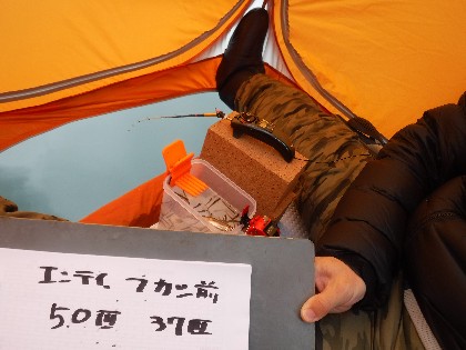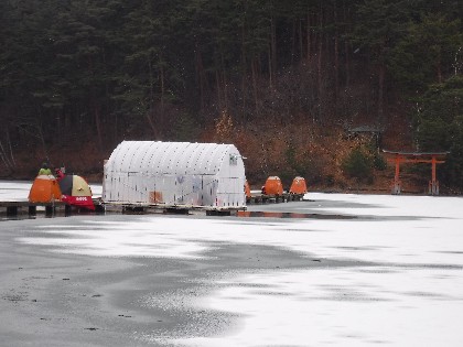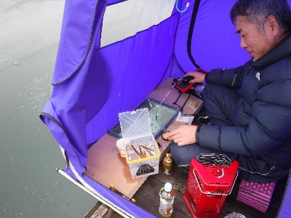 今日のワカサギは降雪で、釣果アップを期待されましたが、桟橋周りの氷が融けていた為、渋い釣りでした。