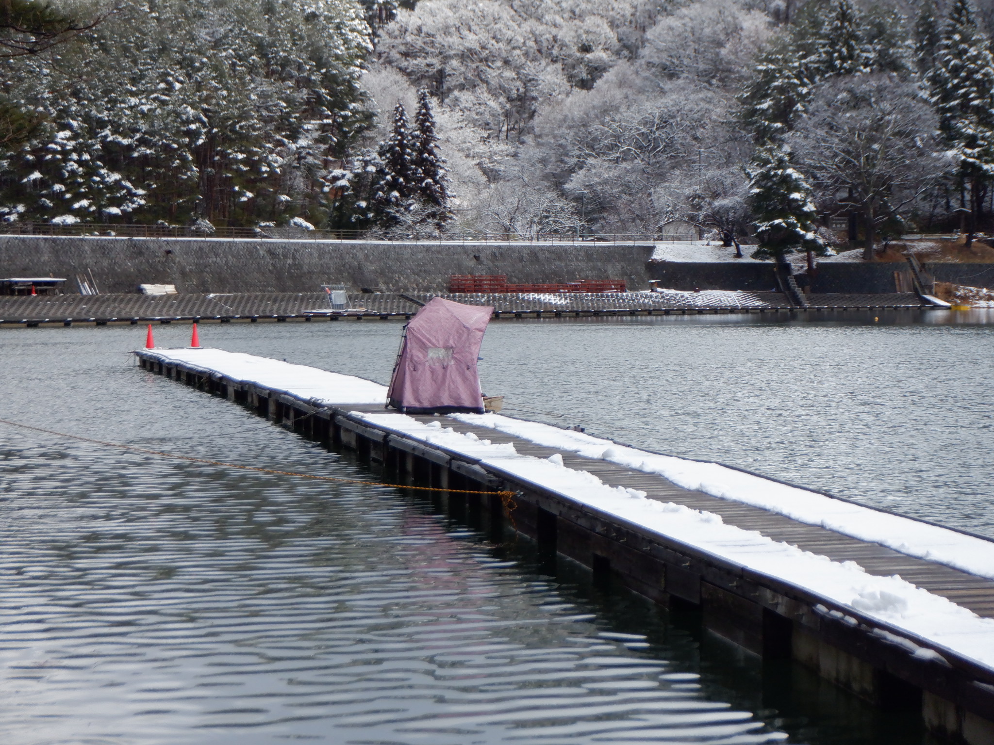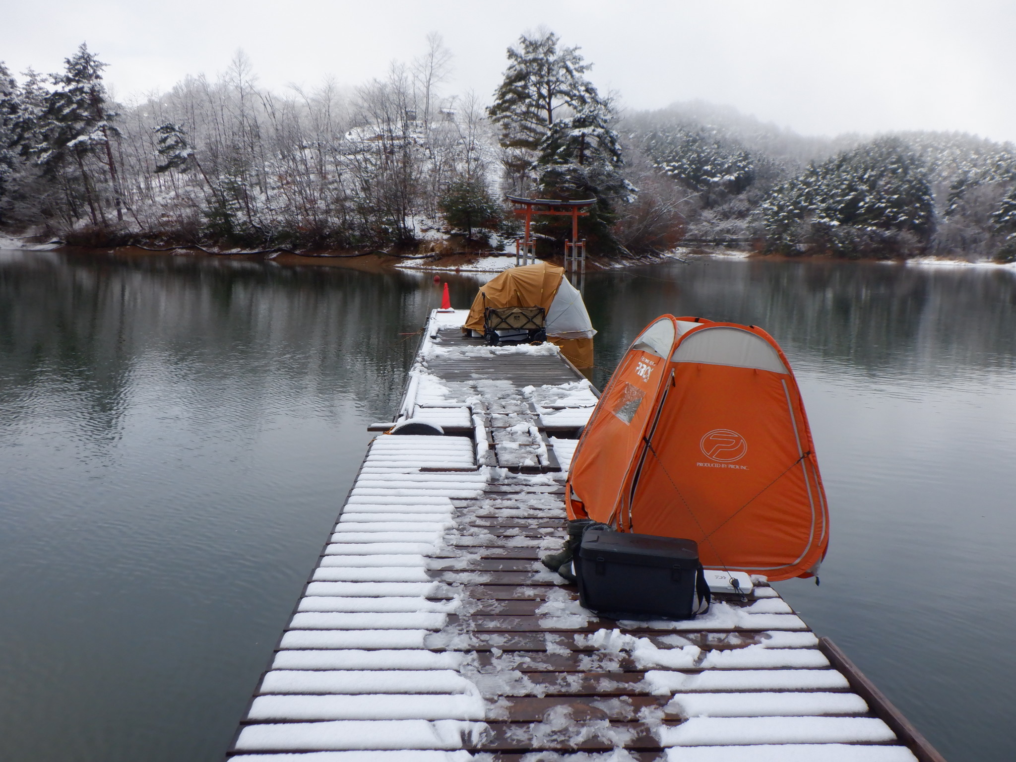 今日の美鈴湖は、朝方数センチの積雪がありました。そんな中、ワカサギ釣りは4人、へら鮒釣りでは1人のお客様にお越しいただきました。